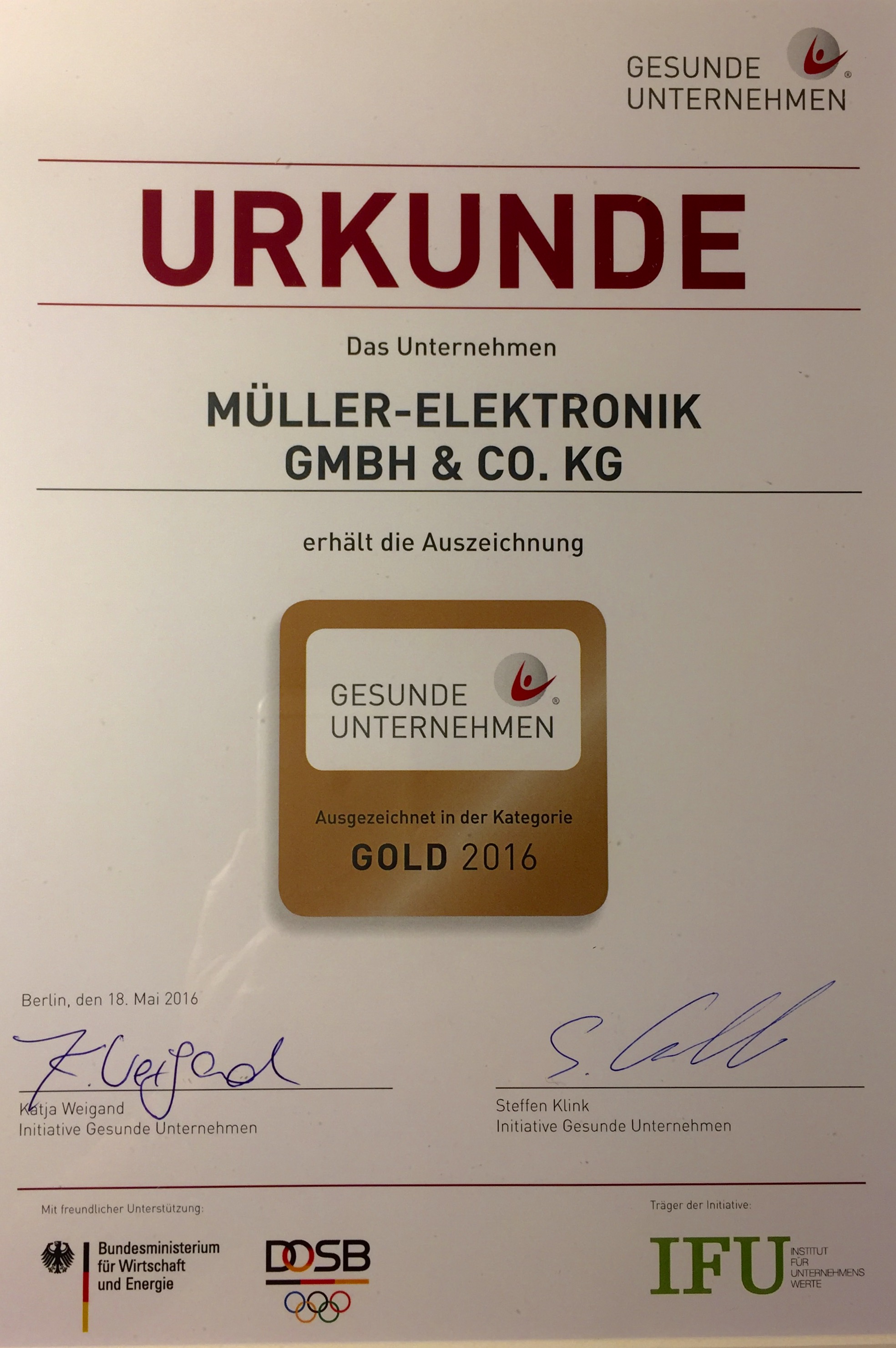 Gesunde und motivierte Mitarbeiter sind für Unternehmen aller Größen und Branchen wichtiger denn je. Das Unternehmen Müller Elektronik hat diese Entwicklung erkannt und wurde für sein Engagement mit der Auszeichnung GESUNDE UNTERNEHMEN in Gold geehrt.